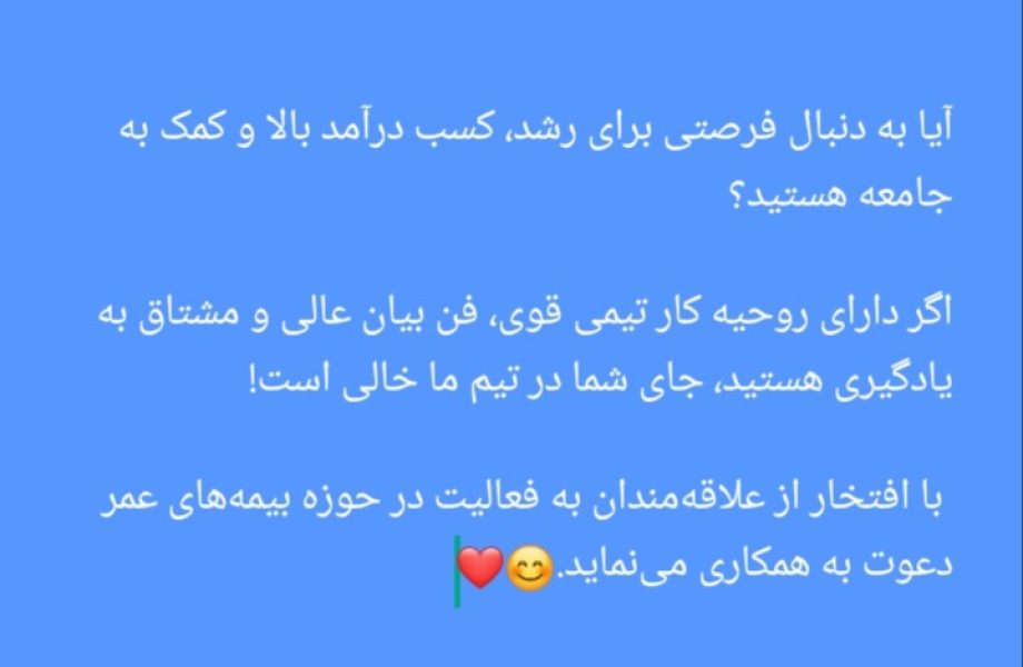 با افتخار از علاقهمندان به فعالیت در حوزه بیمههای عمر دعوت به همکاری مینماید.😊❤️