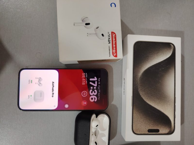 آیفون ۱۵ پرومکس ۲۵۶ زد اا رنگ نچرال ۲۱۰ بار شارژ باطری ۹۸درصد,سری اول ک معرفی شد گرفتم,بدون ضربه و خط و خش,ثبت گمرکی انجام شده,گوشی پروفایل انتن و نت دائم داره,گلس اورجینال برند گرین,دوتا کاور اورجینال هم داره که تقدیم خریدار میشه,ایرپاد پرو۲ تو تایپ سی جدیدترین ایرپاد پرو۲ خیلی کم کار,با کاور اورجینال کی دوو