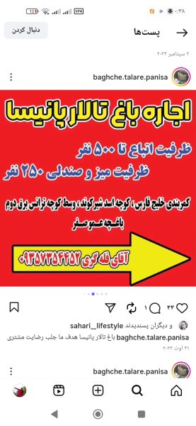 اجاره باغ تالار پانیسا ظرفیت 250نفر طبقه اول و 250 نفرطبقه دوم ، شامل دو طبقه زنانه و مردانه برای عروسی ، عقد و تولد… هنگام تماس گرفتن با این شماره تماس بگیرید 09193909626
