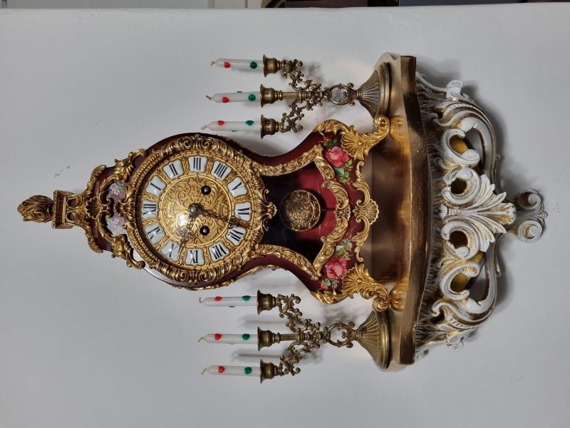 ساعت کنسولی آلمانی با پایه، پاندولی سال ساخت حدود 1910 تا 1920 , با هربار کوک شدن 12 روز کار میکند پاندول با سنگهای یاقوتی و زمزذی تزیین شده