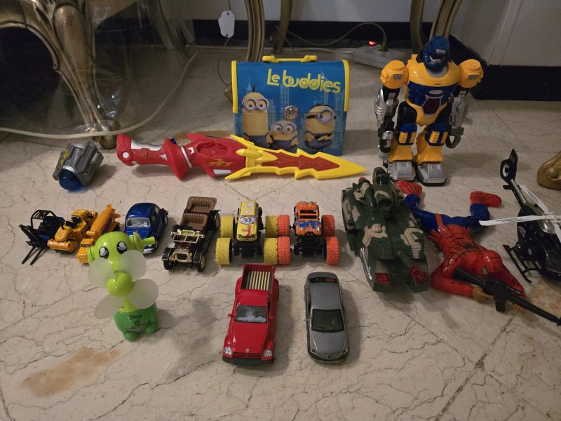 کلکسیونی از اسباب بازی پسرانه همه سالم ماشین های فلزی پلاستیکی آدم آهنی مرد جنگی شمیر قابل تغییر تفنگ هم میشه