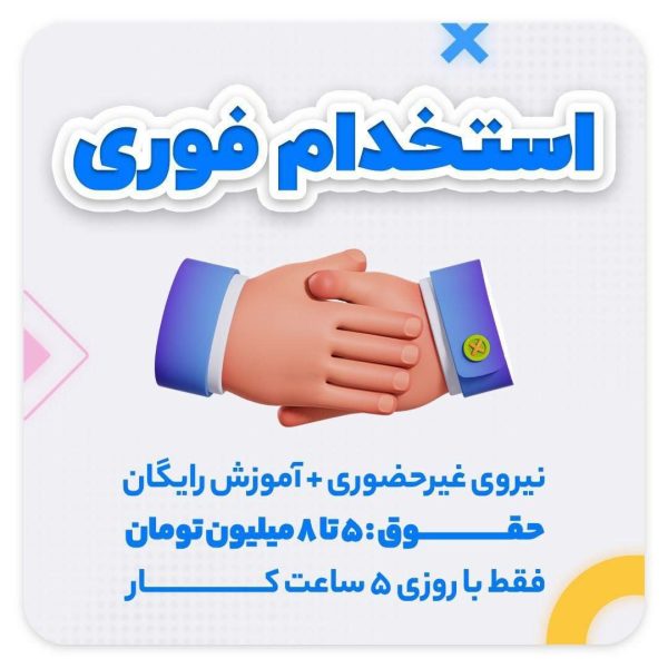 سلام عزیزان امید وارم حالتون خوب باشه تعدادی از مشاغل هست مثل تایپیست،تایپ صوتی ،گویندگی ،مترجم ،ادمینی، نقاشی ،عکاسی ،تهیه ویدیو ،پاورپوینت……و خیلی دیگ که تعدادی از افراد رو ما استخدام میکنیم طبق هر کدوم که شما علاقه دارید یا استعداد خوبی توش دارید و میتونید روزانه یا هفتگی یا ماهانه حقوق خوبی دریافت کنید و (نیاز به هیچ مدرکی نیست با هر مدرکی که هستید میتونید کار کنید )بهتون تضمین میدم و همچینین اعتماد میدم که هیچ کلاه برداری در کار نیست برای اطلاعات بیشتر پیام بدین پاسخگو شما عزیزان هستم
