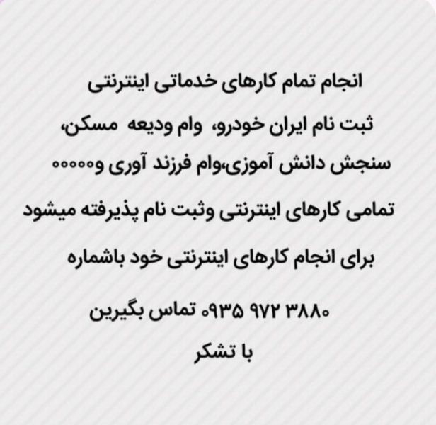 باانجام تمامی خدمات اینترنتی غیرحضوری درخدمت عزیزان هستیم. ثبت نام ایران خودرو. ثبت نام وامهای فرزنداوری. ودیعه مسکن و… ثبت سجام و ابلاغیه الکترونیکی . سنجش دانش اموزان و کلیه خدمات اینترنتی .