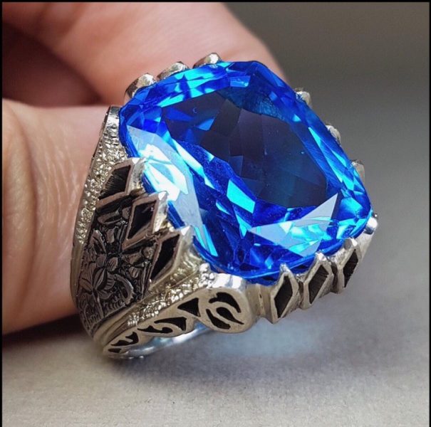انگشتر نقره ۹۹۵ با جواهر توپاز وزن ۴۲ قیراط شاهکار دست استاد احمد حسینی اخراجکاری با ۱۲ قطعه الماس برلیان اصل وزن کل کار ۳۲ گرم بسیار زیبا و فاخر
