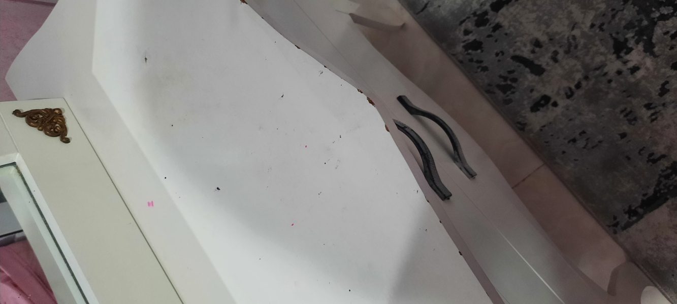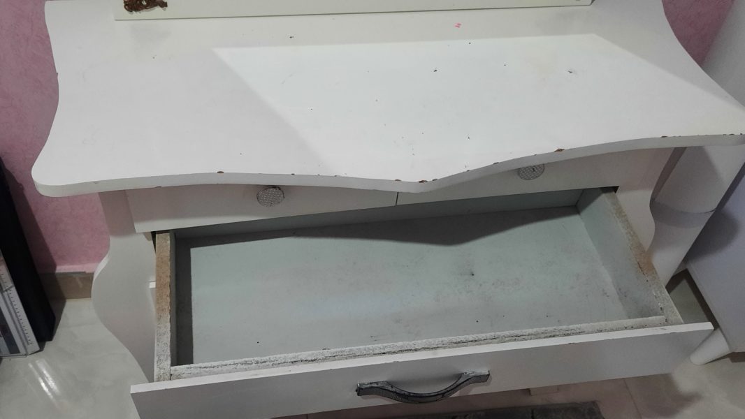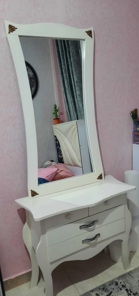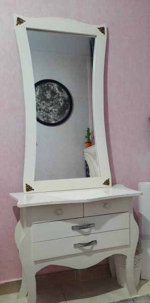 ایینه کنسول جنس نئوپان، روکش ملامینه ،سه کشو جا دار ، ایینه کاملا سالم ، کنسول روی سطحش یه مقدار رنگ پریدگی داره ،