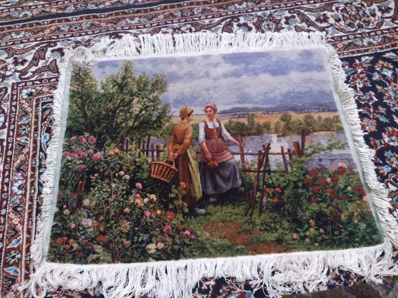 تابلو فرش دست بافت کنار رودخانه ۵۰۰ گره ای ۳۸۶ رج و چله پنبه داخل بافت ابریشم در ابعاد ۸۳ در ۶۳ ساتتی متر، برجسته شده