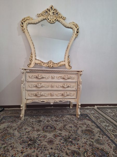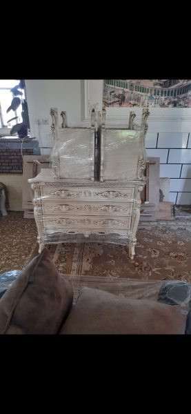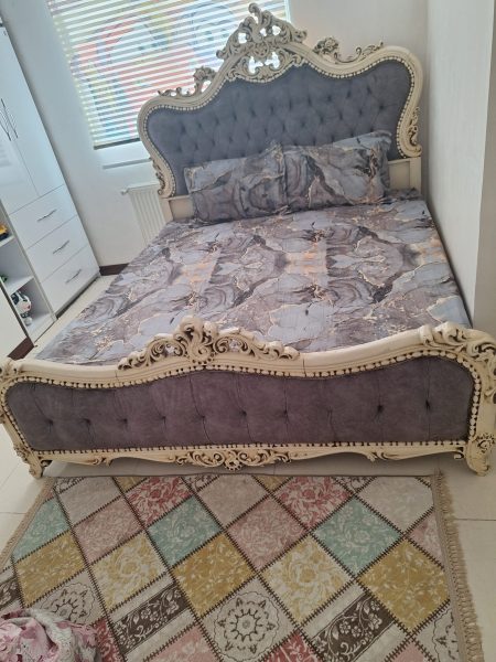 تخت خواب دونفره همراه تشک همراه میز ارایش و ۲ عدد پاتختی و صندلی