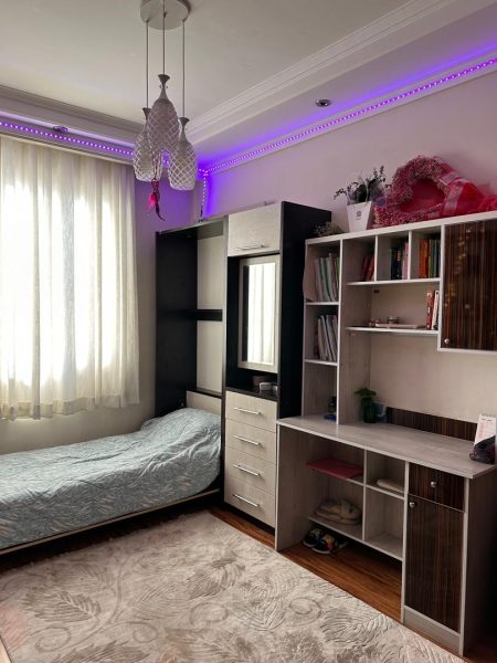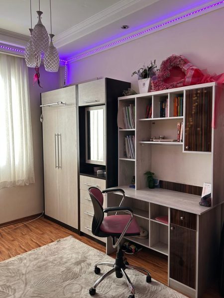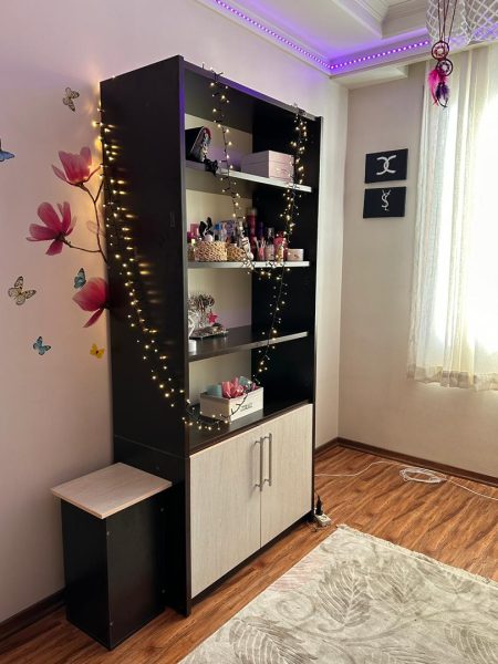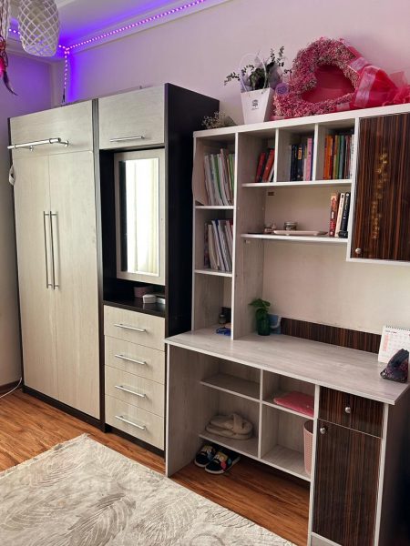 سرویس کاملا تخت خواب شو با باکس پا تختی و کتابخانه و میز اینه و تشک خوش خواب و میز التحریر همراه با کتابخانه روی آن