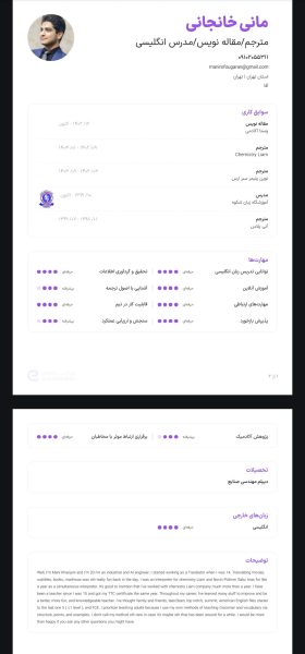 مانی خانجانی هستم. مدرس و مترجم زبان انگلیسی. تجربه کاری ۵ ساله و همکاری با شرکت های پلیمری و آموزشگاه های مطرح در تهران. آشنایی با تدریس در سطوح مختلف زبانی از سطح مبتدی تا پیشرفته و IELTS