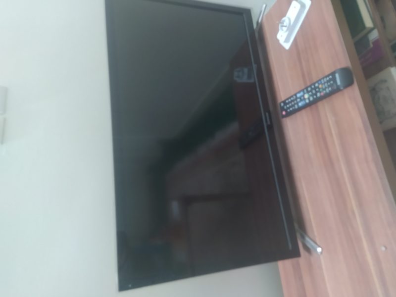 تلویزیون ال ای دی هوشمند سامسونگ کره آیی به همراه میز رنگ قهوه آیی روشن