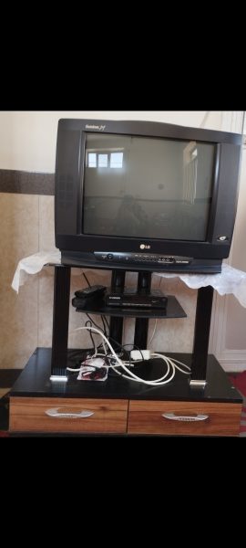 تلویزیون و همراه دستگاه دیجیتال و میز
