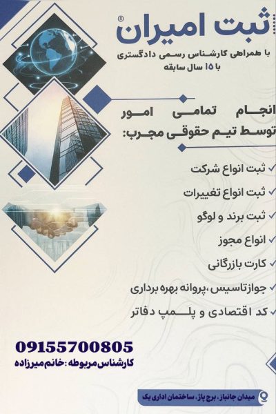 ثبت،انحلال و ثبت برند و لوگو،اخذ جواز،پروانه و کارت بازرگانی ،پلمپ دفاتر با همراهی کارشناس رسمی دادگستری با ۱۵سال سابقه کاری