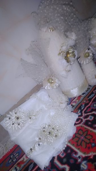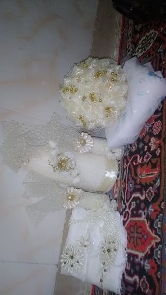 دسته گل عروس چادر عروس آماده یه کله قند بزرگ دوتا کوچیک سفره کله قند رنگ کرم قهوه ای نو استفاده نشده