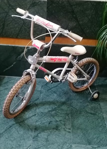 دوچرخه کاملا سالم و کم استفاده، سفید رنگ، همراه کمکی مناسب 4 سال به بالا