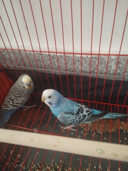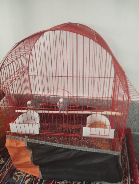 دو عدد مرغ عشق نر ماده ماده فیروزه‌ای نر آبی و زرد تازه جفت شده قفس هم نوع هست رنگ قفس قرمز