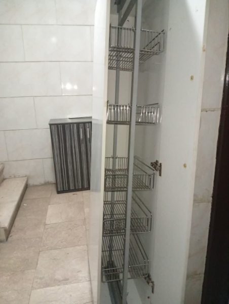 سبد سوپر مارکت آشپزخانه ۵طبقه ریلی با کابینت mdf درب کابینت سفید ارتفاع ۱۸۰ عرض ۳۰