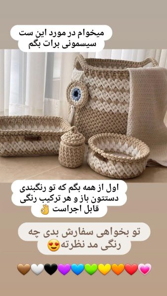 ست کامل سبد تریکویی برای سیسمونی و جهیزیه در هر سایزی قابل سفارش برای دیدن نمونه به پیج اینستا مراجعه کنید @gisd_baafttt