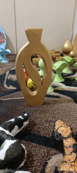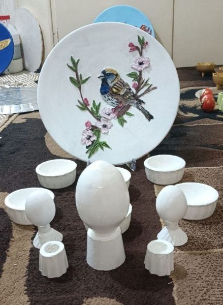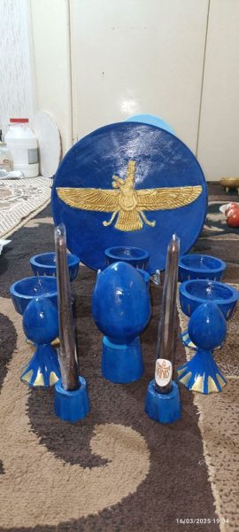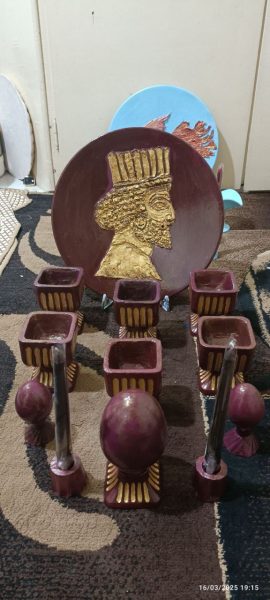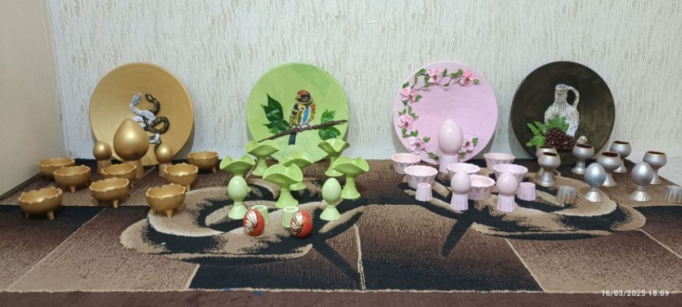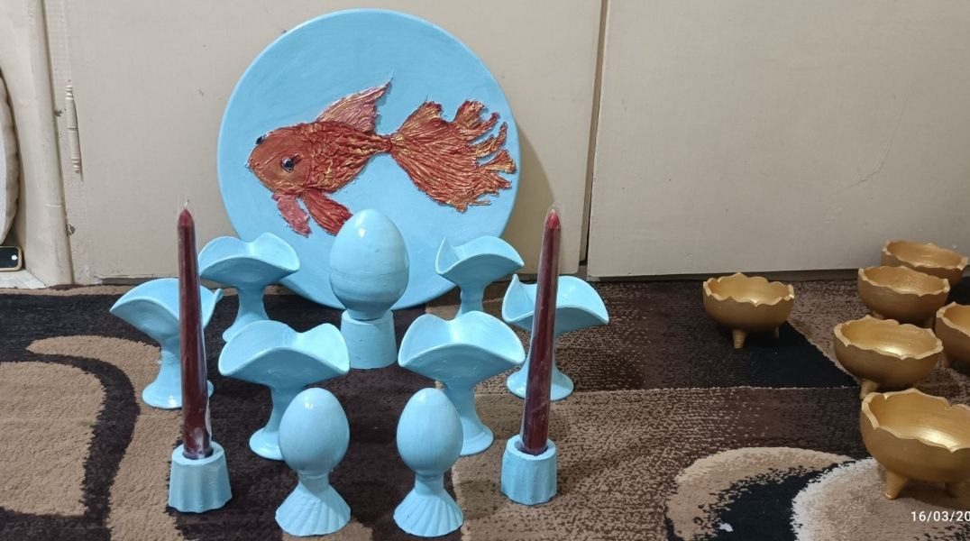 ست هفت‌سین داری یک سینی برجسته ۳۵ سانتی که بعدا هم به عنوان دیوار کوب میتونید استفاده کنید به همراه دو عدد جا شمعی و دو عدد تخم مرغ کوچک با پایه یک عدد تخم غاز با پایه و شیش عدد ظرف هفت سین
