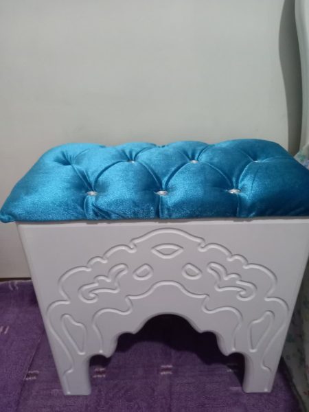 سرویس خواب دونفره شامل تخت، پاف، صندلی آرایش، دراور، پاتختی