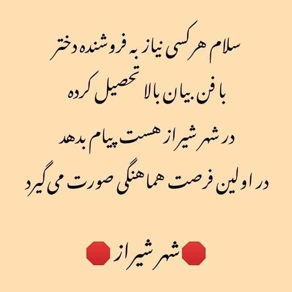 سلام هرکس نیاز به فروشنده دختر دارد برای قبل عید پیام دهد البته ساعت های عصر و صبح الی چرخشی