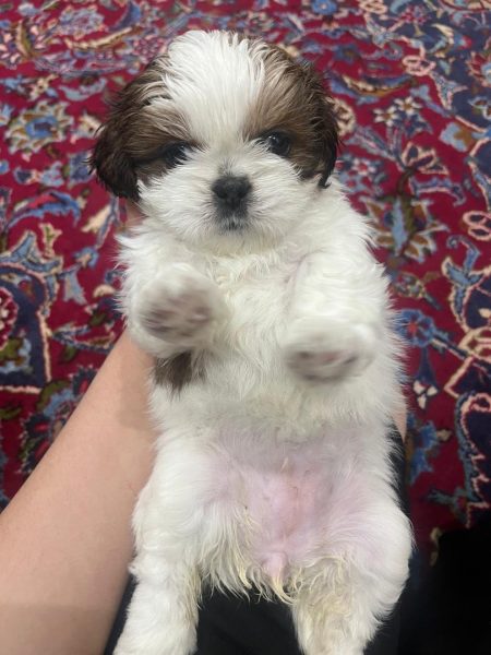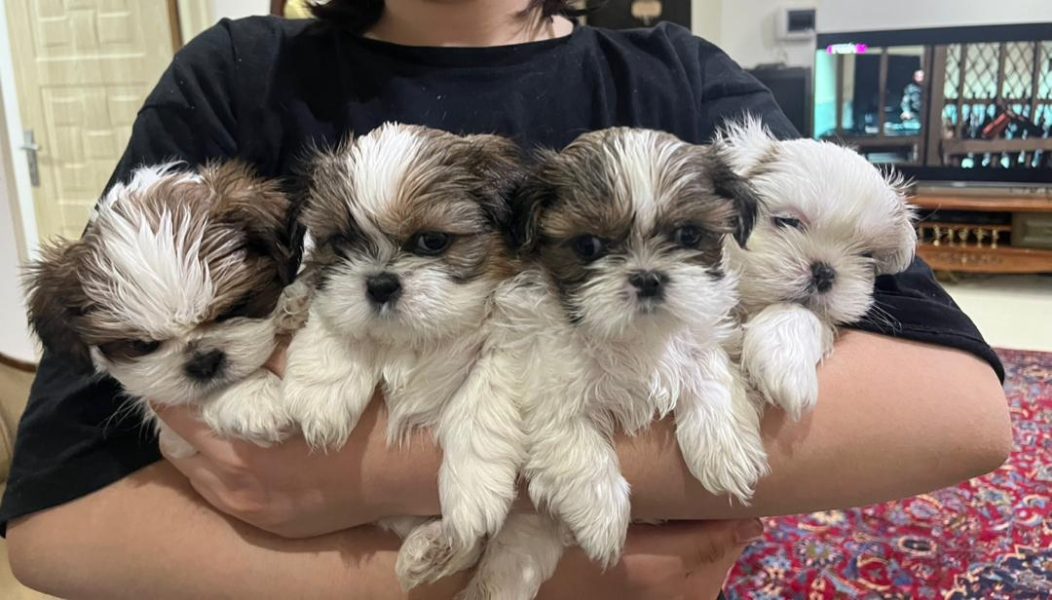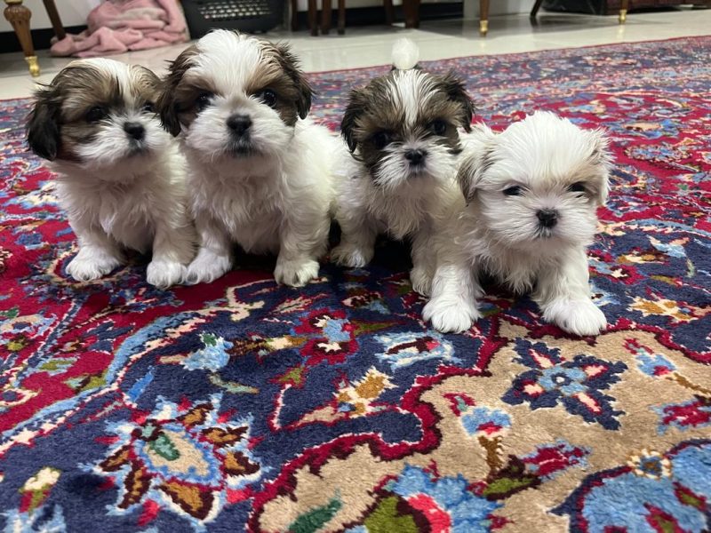 چهار عدد شیتزو سوپر فلت سه تا سفید و قهوهای یک عدد سفید سفیده دو تا چشماش ابیه دو تا ماده دو تا نر ۴۰ روزه دونه ای سه میلیون و پانصد