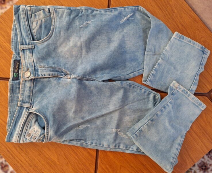 شلوار جین آبی روشن قد۹۲ سانت و مناسب سایز۴۰ و احتمالا تا۴۲ هم بخوره کلا شاید دو یا سه بار پوشیده شده باشه و در حد نو هست