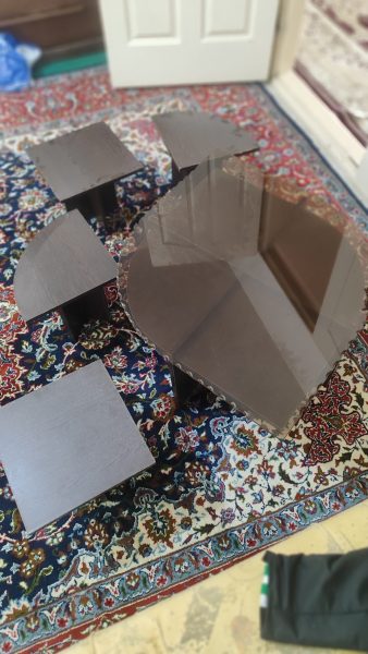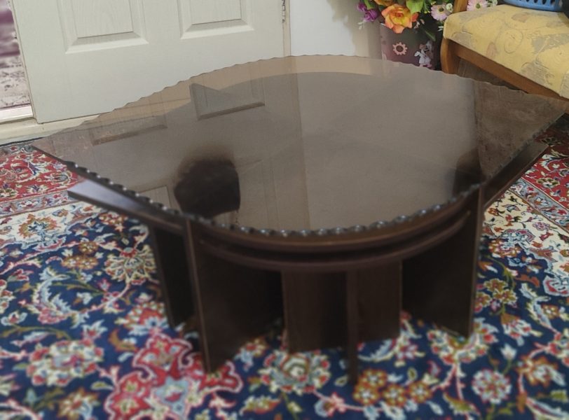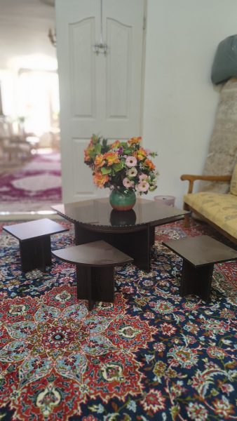 یدونه میز بزرگه پذیرایی داره چهارتا هم میز کم وپیش کوچیکه داره زیر شیشه یه جاداره که میتونی زیرش سنگ های رنگی بریزی یا هرچی برای خوشگل شدنش جنس چوبش خیلی خوبه بغل های شیشه نقش های خوبی داره میز خیلی تمیز هستش