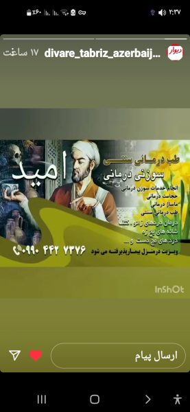 خدمات درمانی دردهای زانو.کمردرد .گردن درد.شانهای یخ زده و…انجام حجامت وماساژ درمانی.درمان بدون عمل جراحی وداروهای شیمایی.عزیزانی که به دلایلی نمیتونن به مطب مراجعه کنن .خدمات در منزل بیمار پزیرفته میشود