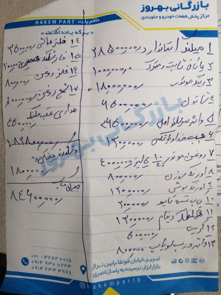 حدود دو هفته هست موتور طبق فاکتور تعمیر اساسی شده که حدود 18 میلیون… رادیاتور بخاری و آب هر دو تازه…. شفتها حدود 6 میلیون خرج شده….گاز کاملا سالم… کولر روشن… شاسی ها کاملا سالم و بدون فشار…دور رنگ …بیمه تا برج 6…