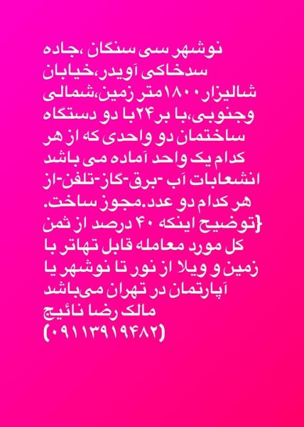 [توضیح اینکه ۴۰درصد از ثمن کل مورد معامله قابل تهاتر زمین و ویلا از نور تا نوشهر یا آپارتمان درتهران میباشد]
