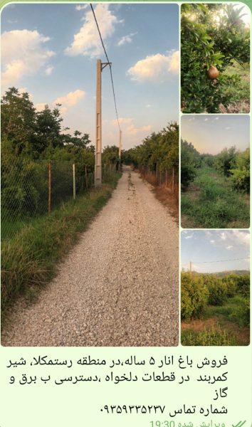 باغ انار ۵ ساله،ابیاری قطره ایی،نزدیکترین فاصله ب جاده اصلی و جنگل و شهر،با چشم انداز زیبا،مکانی امن و ارام،دسترسی ب برق و گاز،کنار بافت ساخت و ساز ،موقعیت شمال جنوبی، فروش در ابعاد دلخواه