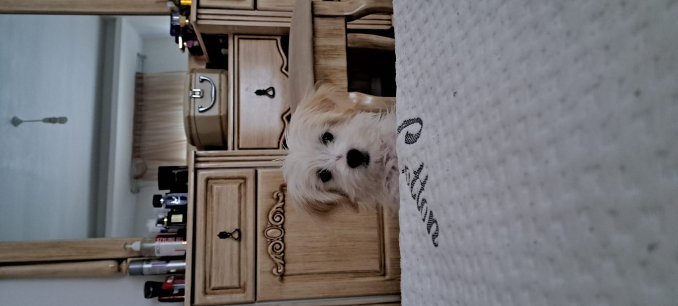 سگ ماده.4ماهه.تربیت شده.واکسن خورده.شناسنامه دار.باتمام لوازم(ناخنگیر.برس.شونه.جای خواب.ظرف اب وغذا)