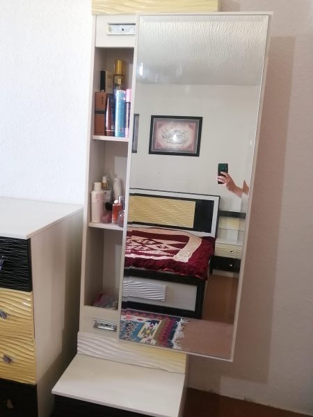 شامل تخت دو نفره، دو عدد پاتختی دو کشویی، دراور 4 کشو، میز ارایشی قدی و به صورت ریلی هست پشتش طبقه داره و دارای یک کشو