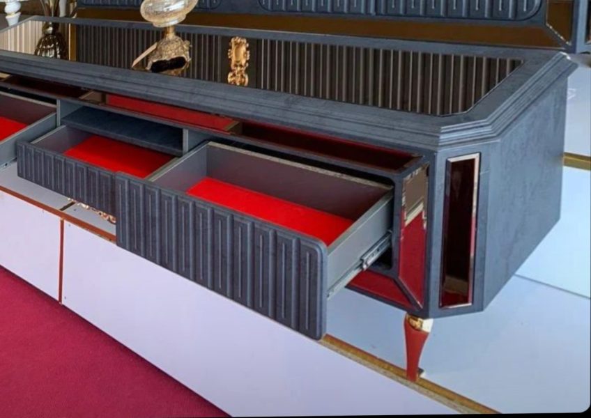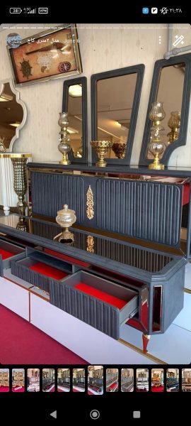 میزتلوزیون دارای ابعاد 2متر دررنگ طوسی طلایی پایه های فلزی طلایی