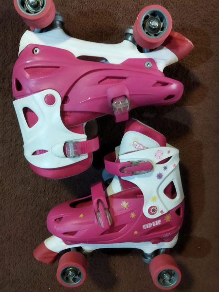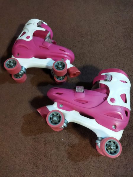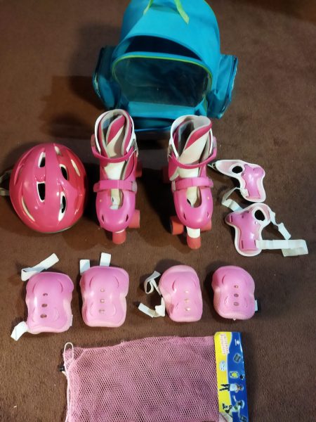 یک جفت کفش چرخ دار یا اسکیت ترمزدار قابل تغییر از سایز ۳۷ تا ۴۱ بهمراه کلاه ایمنی بنددار ، زانو بند ، آرنج بند ، مچ بند و کیف مخصوص با رنگ صورتی و ست با کفش ها به فروش می رسد .