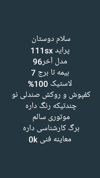 این خودرو تمام وسایل مصرفی مانند تسمه ها لاستیکها جلوبندی روکش صندلی و کفپوش هیدرولیک فرمون انباری اگزور چراغهای عقب اسپرت واتر پمپ تازه تعویض شده و نو میباشد
