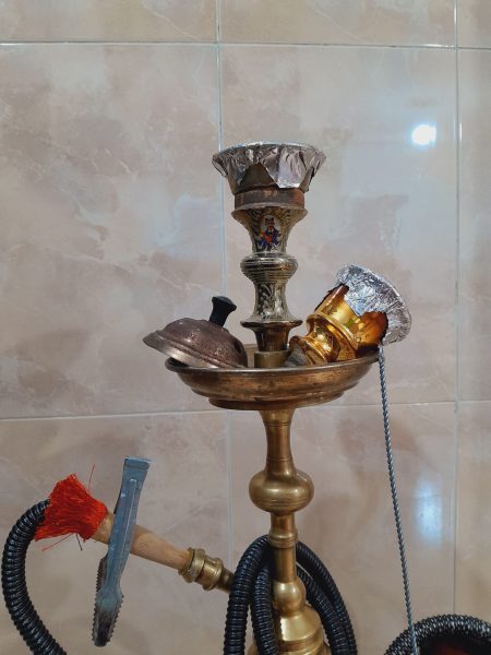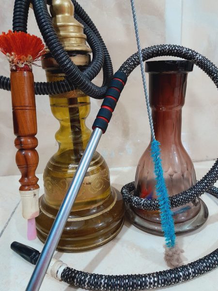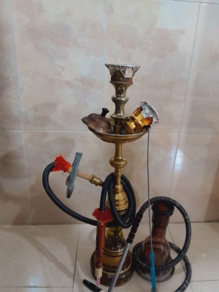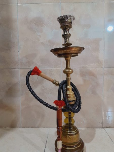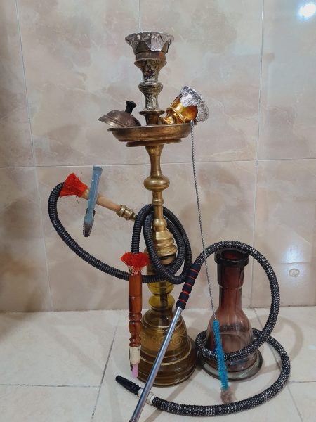 قلیان برنجی دارای ۲شیشه و ۲ شلنگ و ۲ سری  در رنگ و طرح مختلف و یک ذغال گردان کوچک و انبور و فرچه تمیز کردن تنه قلیان