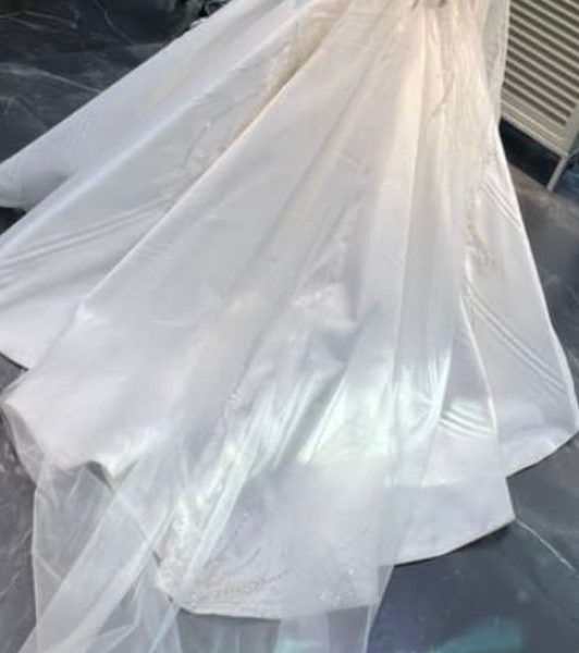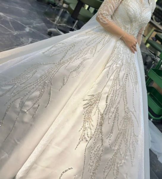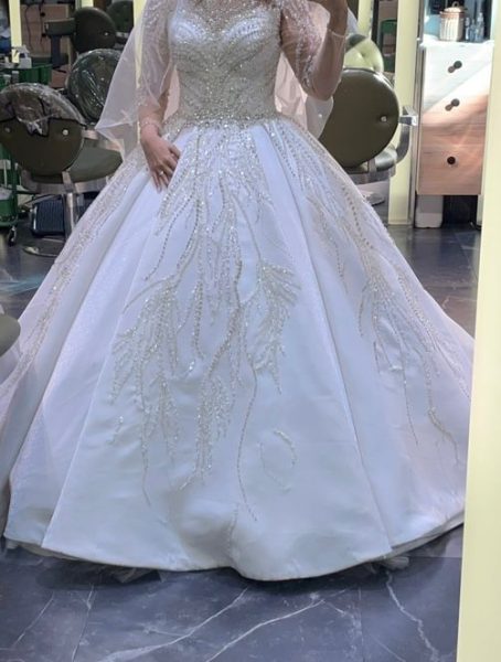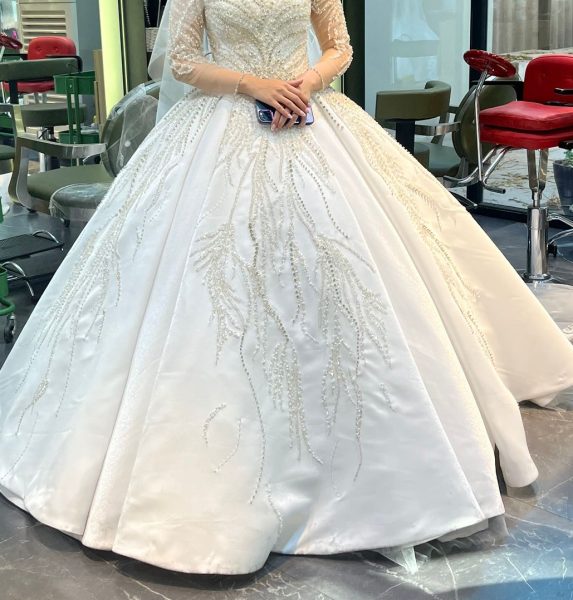 لباس عروس در حد نو فقط یکبار استفاده شده مزونی با پارچه کار شده دانتل دوزی و سنگ های اتریشی دست دوز آستین دار یقه ۳ سانتی دامن پفی دنباله دار همراه ژپون سبک عربی