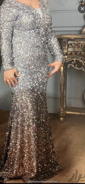 لباس مجلسی شیک زنانه یه بار استفاده شده رنگ نقره ای پایین لباس طلایی از نزدیک خیلی قشنگتره