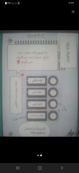 لولهبازکنی نشت یابی لوله کشی کلی وجزعی نصب پمپ وتانک وسرویس کردن نصب پکیچ وسرویس کردن نصب توالت فرنگی وسرویس کردن نصب شیرآلات وسرویس کردن نشتی لوله های آب وفاضلاب بادستگاه پیشرفته وباافرادکارآموخته وکاربلد در آوردن اشياي قیمتی وغیره بازکردن لوله های آب سردوگرم بادستگاه پیشرفته ومواد مخصوص سخت ودشوارترین لوله های که ریشه درخت سیمان قیل گچ وغیره داخل لوله هست فقط کافی یک بار بادستگاه الکترو فنرفرغانی امتحان کنیدودیگرنگران گرفتگی وکثیفی نباشید بابهترین سرویس کارهای حرفی وکارآموخته لولهبازکنی بادستگاه الکتروفنرکوچک فقط وفقط از170تا350پرداخت کنید ارزان تراازارزانی کارخوب وباقیمت های منصفانه باچند سال سابقه کار در اصفهان وحومه بابیش از نیم قرن سابقه درخشان ارزان تراز همه جا فقط کافی یک بار تماس بگیرید وقیمت هارامقایسه فرمایدوبا افراد خوش برخودوخوش اخلاق ربرو شوید شبانهروزی بدون تعطیلی دراسرع وقت فقط بایک تماس در عرض 20الا30 دقیقه درخدمت شما همشهریان عزیزهستیم بدون معطلی شما همشهریان اورژانسی به امید دیدار