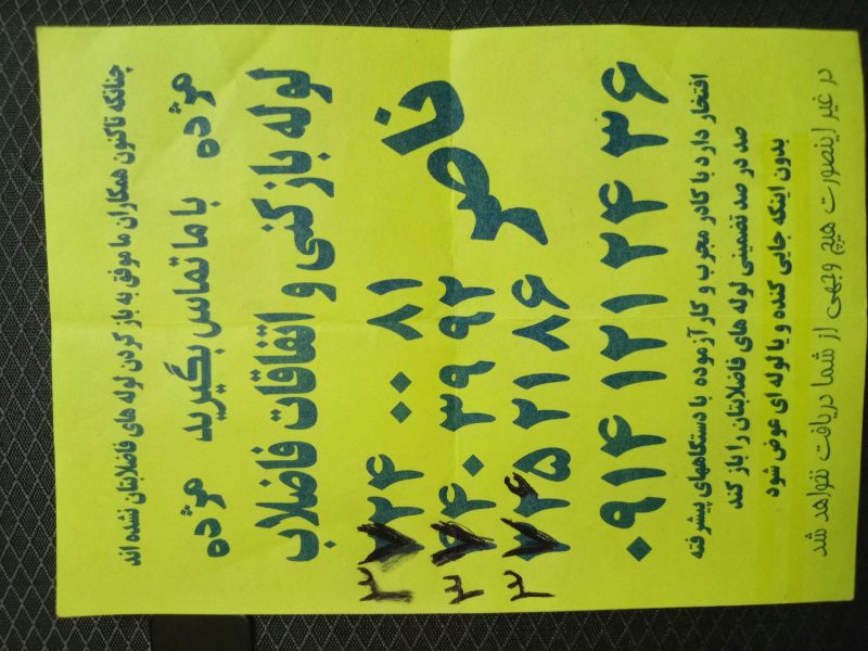 صد درصد تضمینی و ارزانتر ازهمجا اگرچنانکه همکارانمان نتوانستندلولهای فاظلابتان رابازکنندمابدون اینکه جایی رو بکنیم لوله‌های فاظلابتان را باز میکنیم در غیر اینصورت هیچ پولی نمیگیریم
