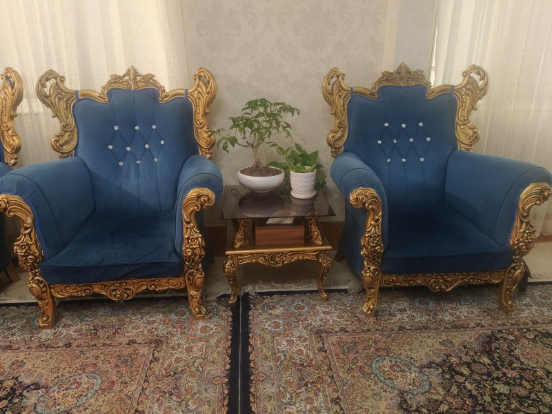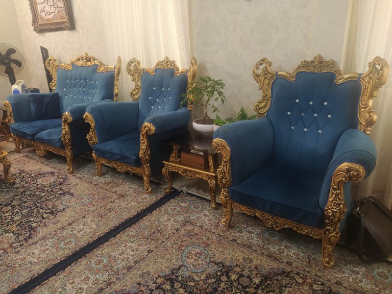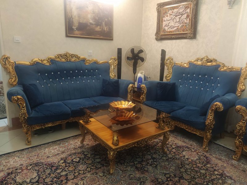 یک دست مبلمان راحتی ۷ نفره با میز جلو مبلی مربع و دوتا عسلی که میز و عسلی دوتیکه هستند