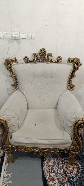 مبلمان سلطنتی همراه با کوسن وجلو مبلی سالم بدون شکستگی چوب راش فقط فرو رفتگی دارن