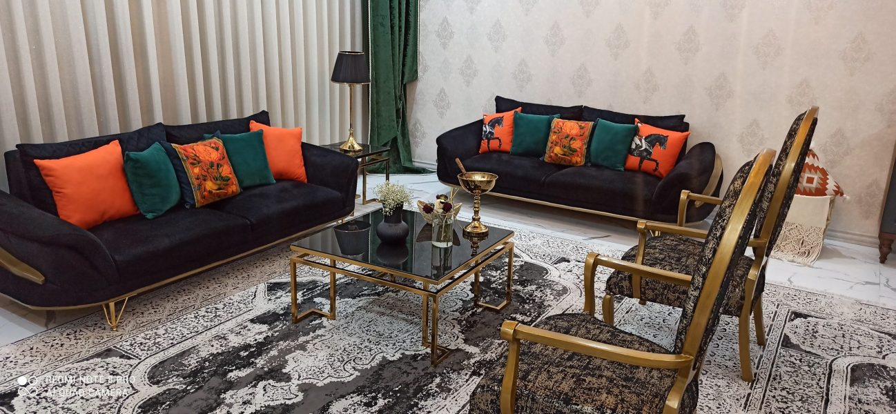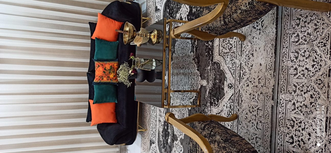 یک دست مبلمان بسیار تمیزهمراه باسه عدد میز استیل طلایی تمیزویک عددمیزتلفزیون مشکی طلایی که ست با سرویس مبلمان هست میتونید تشریف بیاریدازنزدیک تمیزی وسایل هاروببینید