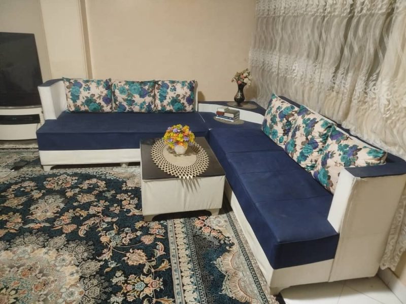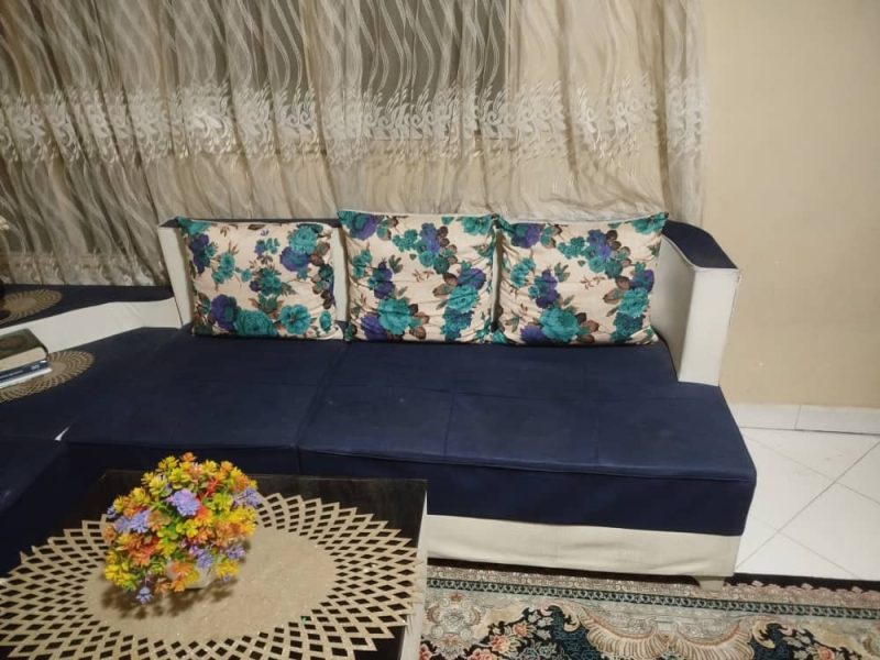 سلام یکدست مبل راحتی ال چرم وپارچه باجلومبلی و۶عددکوسن قابل شستشو رنگ ابی وسفید