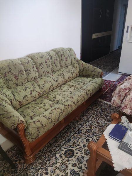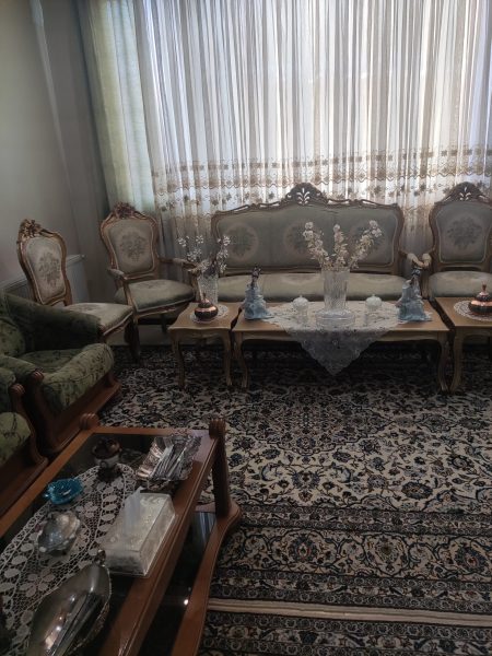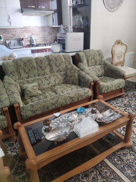 مبل راحتی ۷نفره باچوب گردو بسیار مقاوم جلو مبلی ۳نفره یک عدد عسلی.