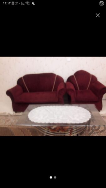 مبل هفت نفره با رویه مخملی سالم به رنگ زرشکی بادوعددمیزشیشه ای با کاور مبل هفت نفره با دو عدد کوسن
