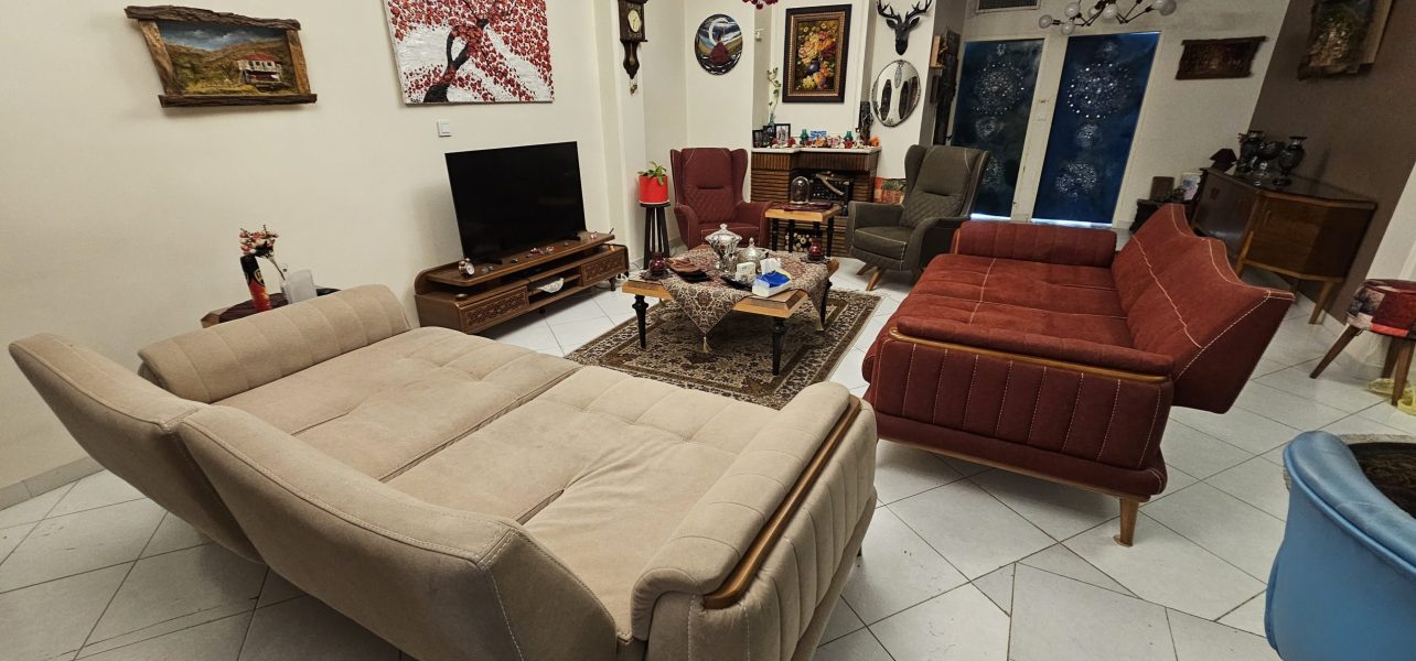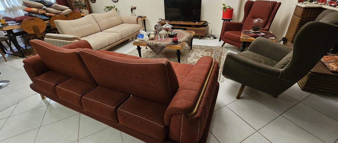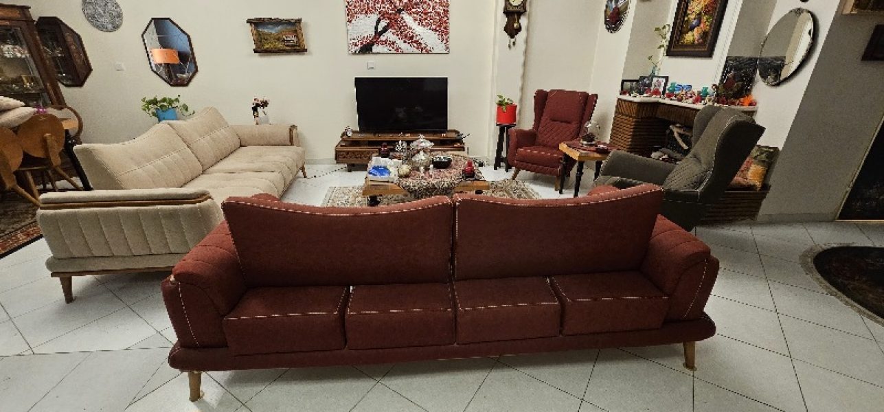 مبل ۸ نفره تخت خواب شو دو کاناپه ۳ نفره و دو مبل تک نفره یکی از مبل ها پایه چرخان دارد
