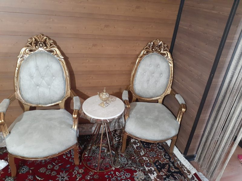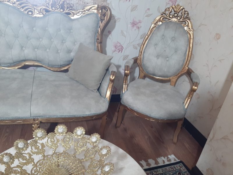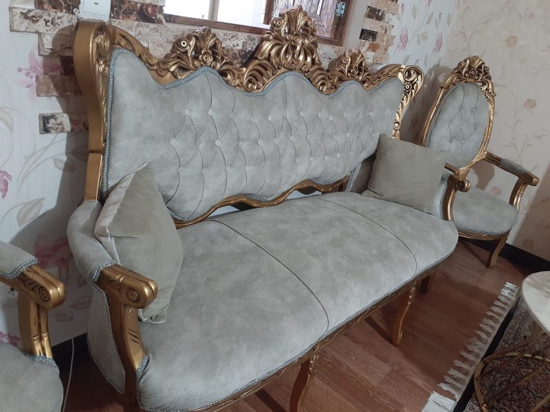 مبل سلطنتی با چوب گردو پارچه ترک با رنگ پسته ی همراه با میز وسط و دوعسلی