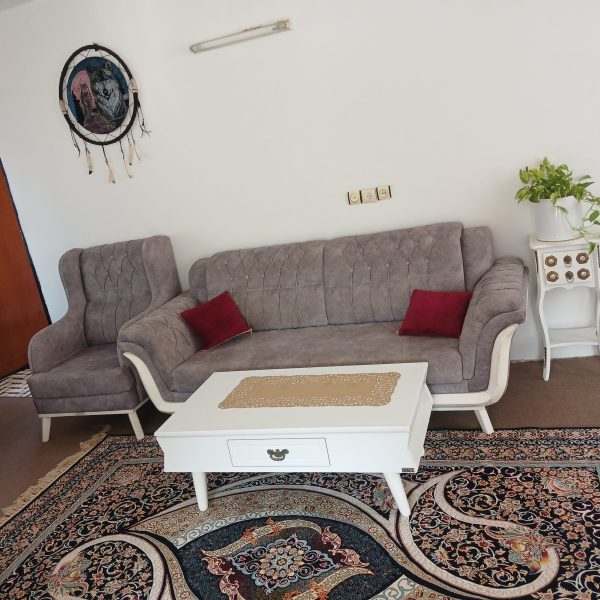 مبل7 نفره کاملا تمیز رنگ طوسی با کوسن های زرشکی با میز وسط رنگ سفید